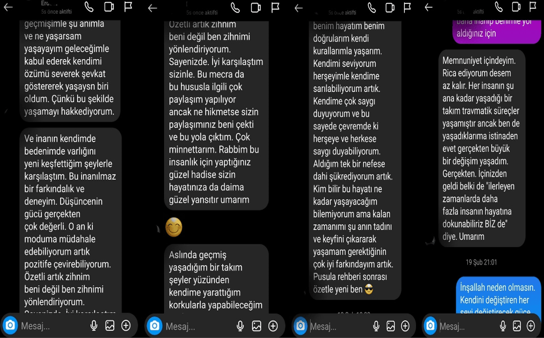 Pusula Rehberi’ni güzel yapan şeylerden biri de hiçbir özel durumunu kimseye anlatmak zorunda kalmadan gelişim sağlamasıdır. Çalışmalar sana has ve sana özeldir. İstemediğin sürece kimseyle paylaşmana gerek yoktur. Kısacası kendi psikoloğun yine kendin olacaksın.